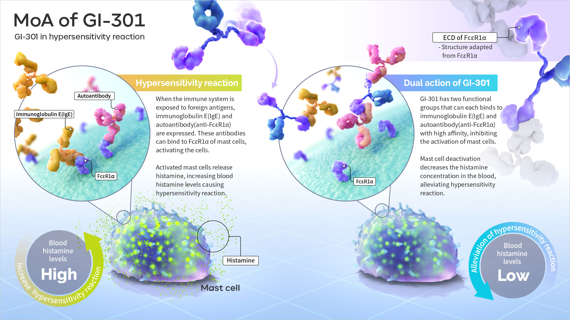 GI-301 has two functional groups that can each bind to IgE and autoantibody (anti-FcεR1α) with high affinity, inhibiting the activation of mast cells.